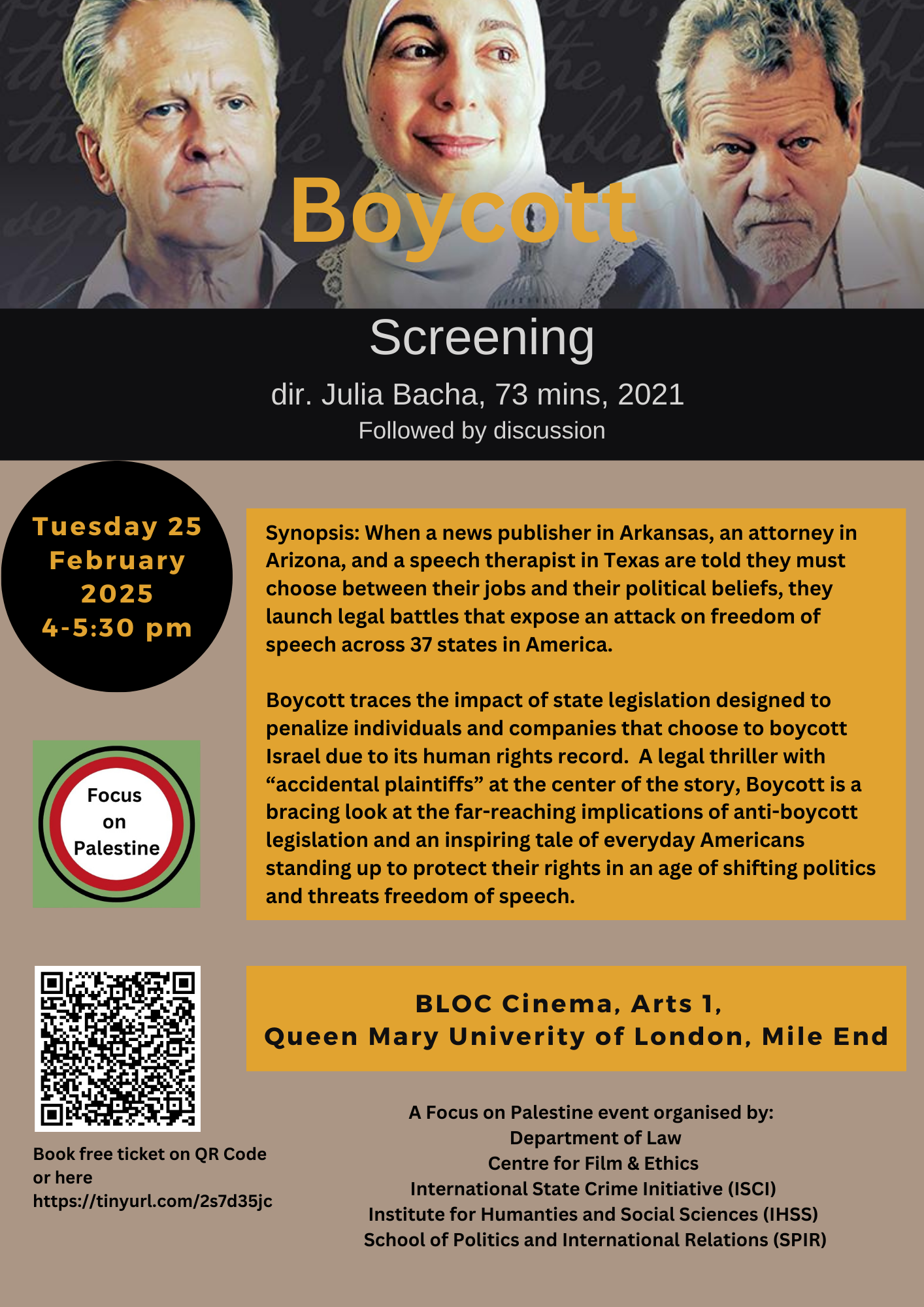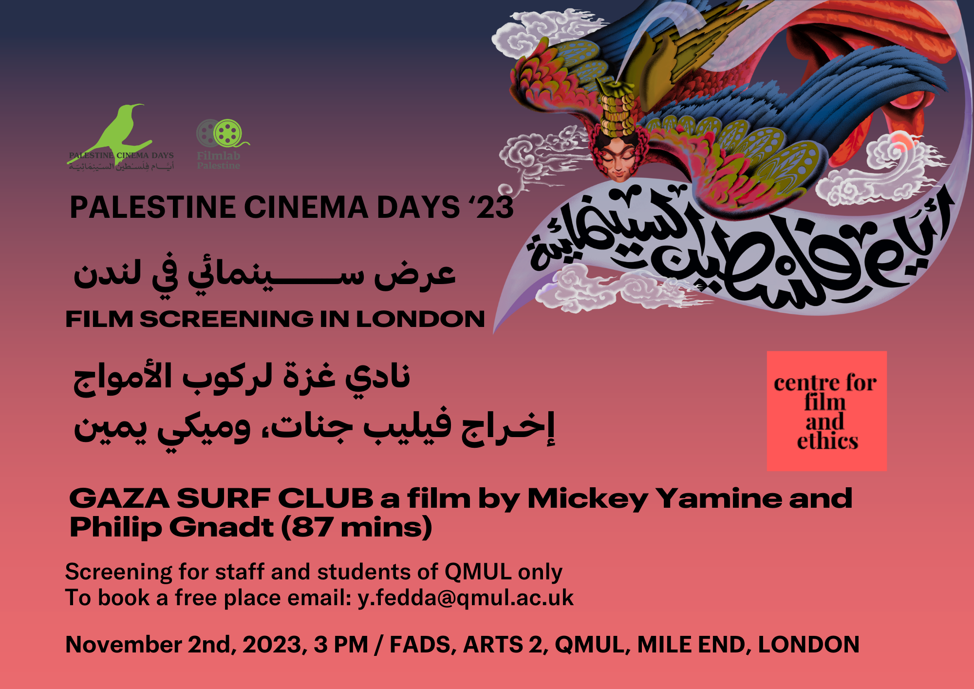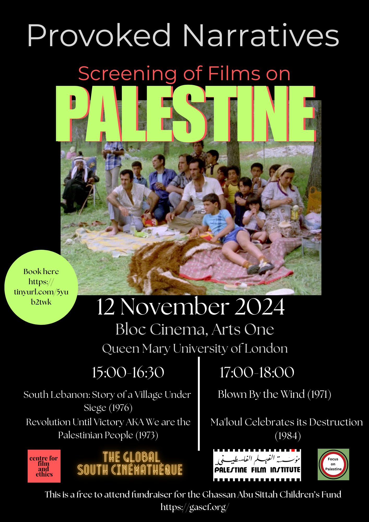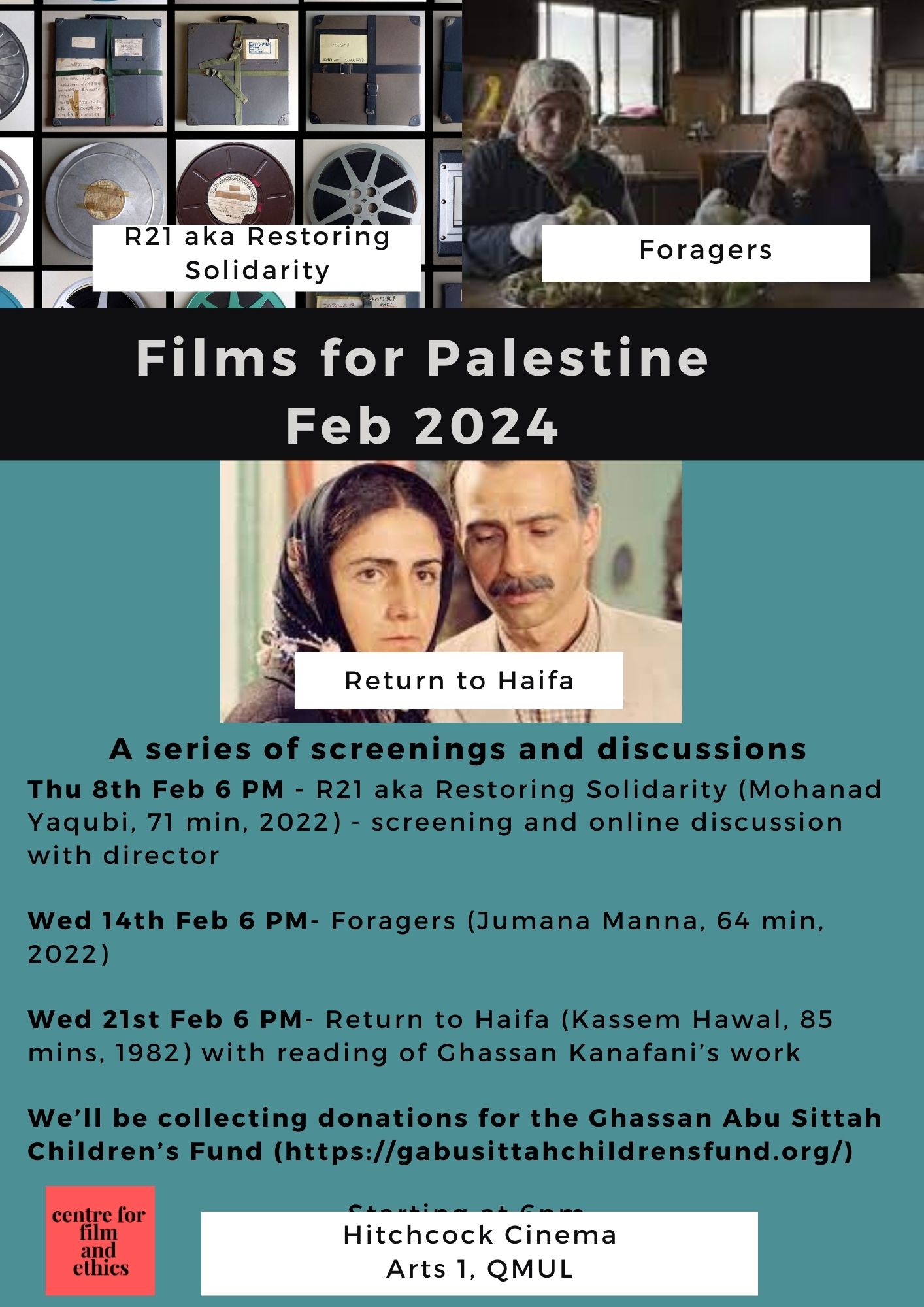 I led on a series of screenings and events at Queen Mary University of London and collaborated with varied partners and organisations including with filmmakers, with the Palestine Film Institute, The Palestinian Museum and with collegues across departments at Film, Law, Politics & International Relations, History and more. Here is a selection: